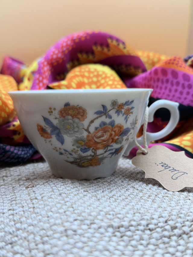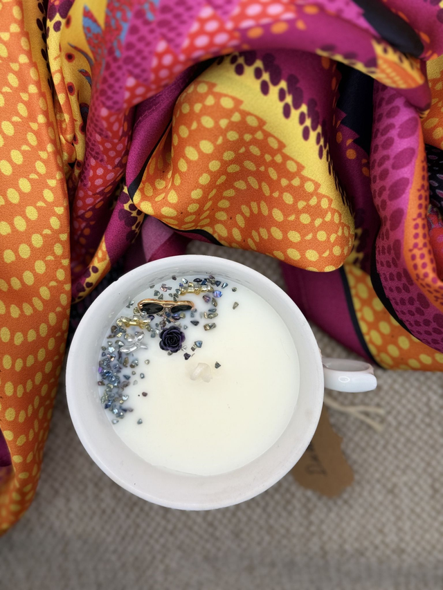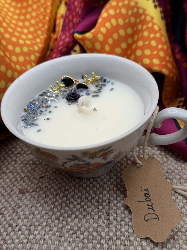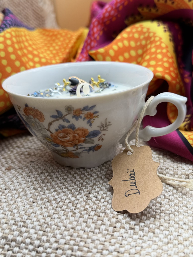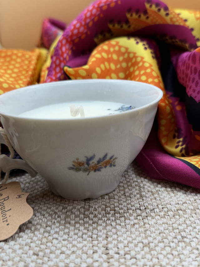 Bougie unique coulée dans sa tasse "seconde main" et décorée par mes soins