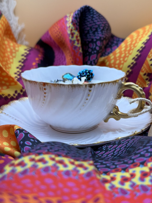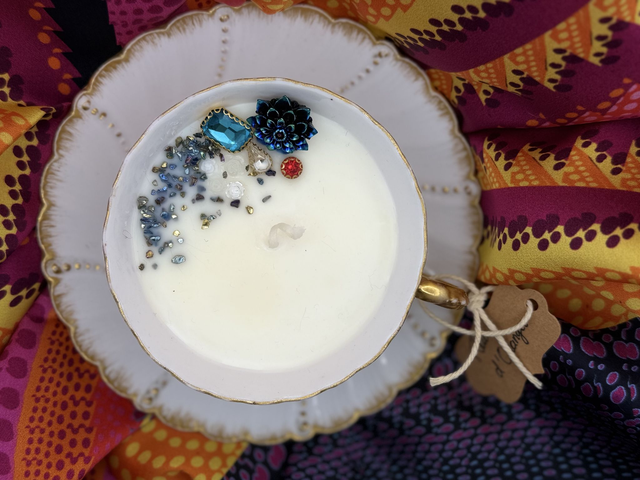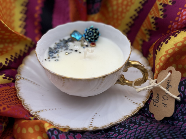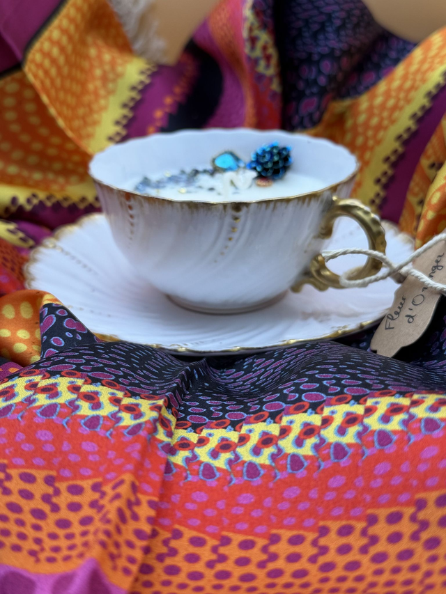 Bougie unique coulée dans une belle tasse et sous tasse motifs dorés et ses bijoux